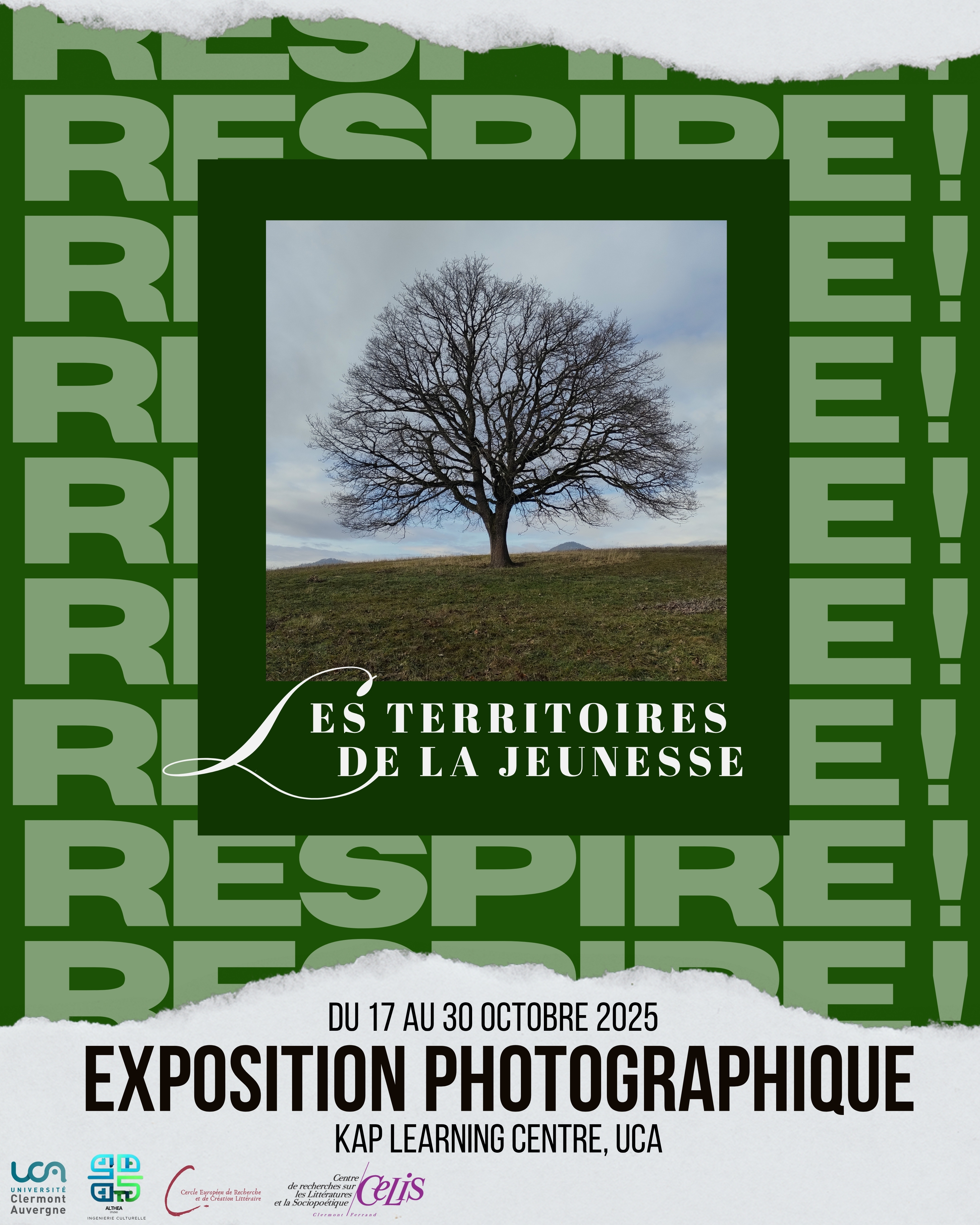 Les étudiants du Master LLCER "Médias & médiation culturelle" et l'Association le CERCL (Collectif Européen de Recherche et Créations littéraires), accompagnés par Valérie Deshoulières, ont plaisir de vous annoncer l'exposition "RESPIRE ! Les territoires de la jeunesse" qui se tiendra au KAP Learning Centre du 17 au 30 octobre 2025.